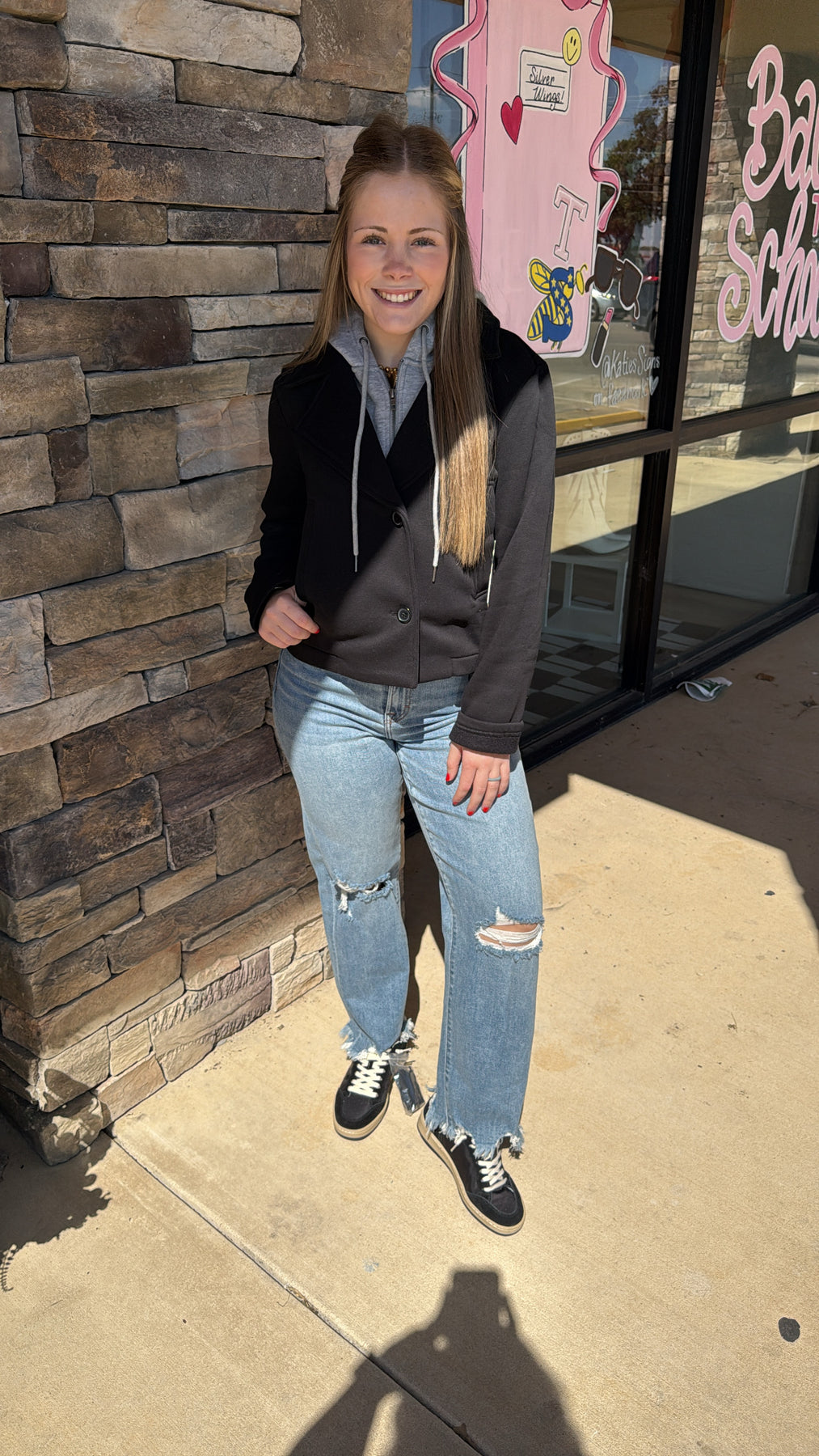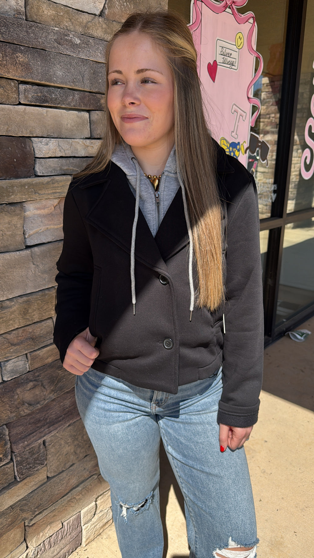 This isn’t your typical blazer—meet the perfect blend of polished and casual. The Comfort Blazer features a structured black silhouette with an attached grey zip-up hoodie insert for a layered, street-style look without the bulk.