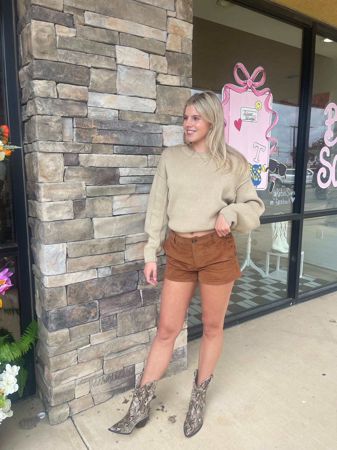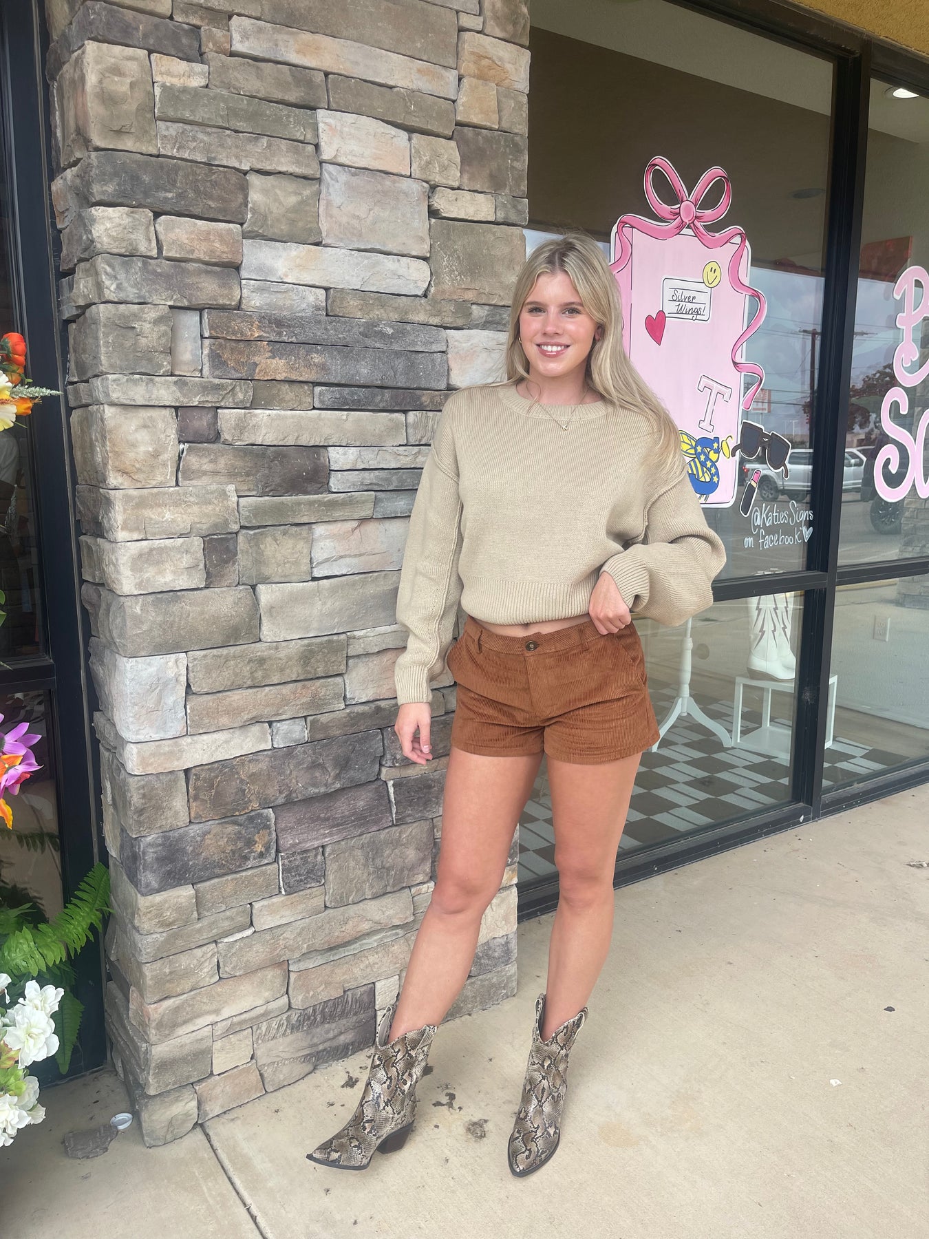 Wrap yourself in autumn comfort with this soft, neutral-toned sweater. Its relaxed fit and timeless crew neckline make it the ultimate layering piece for crisp fall days. Pair it with corduroy shorts, jeans, or skirts for an effortlessly chic seasonal look that’s as cozy as it is stylish.