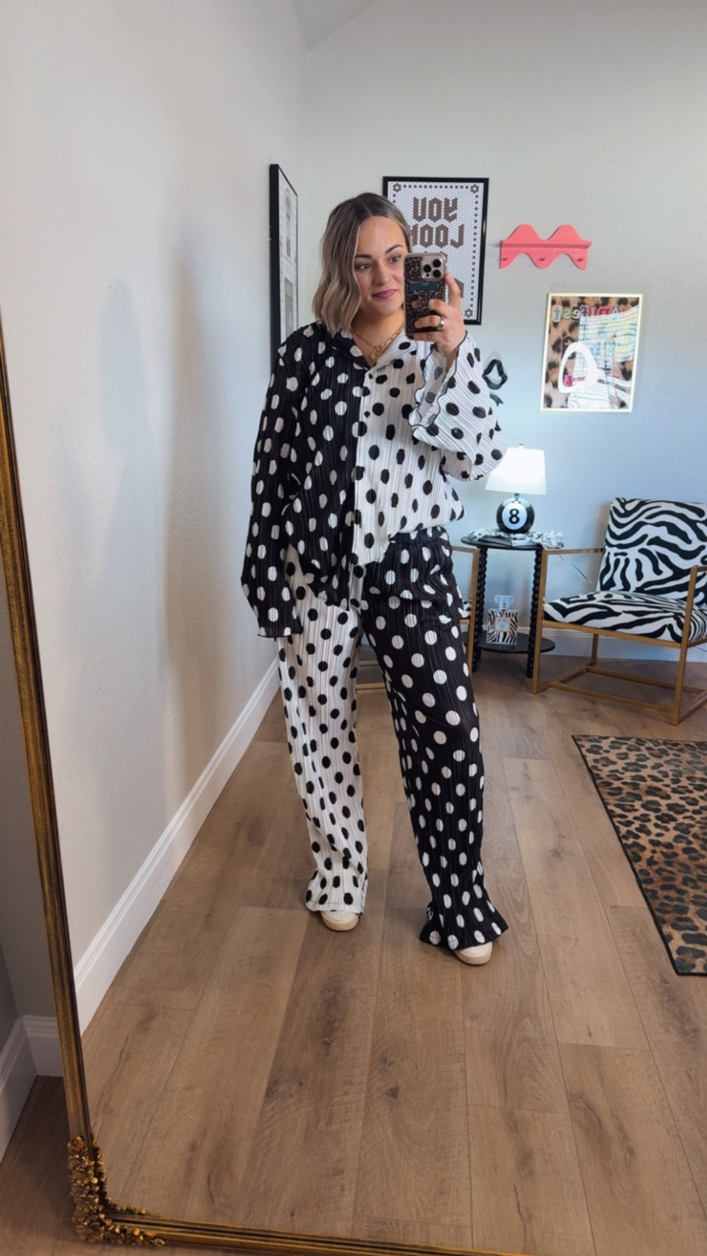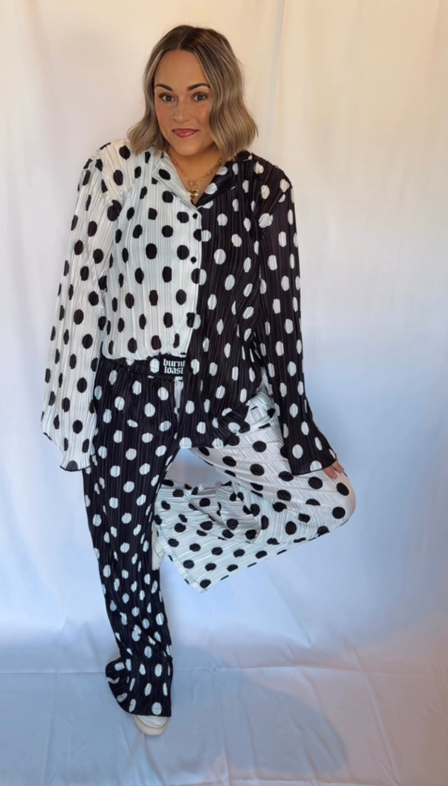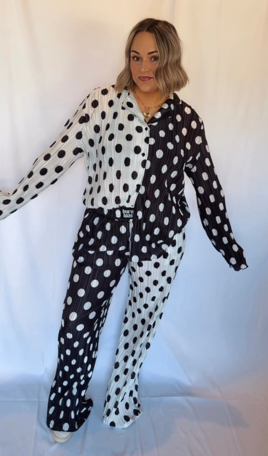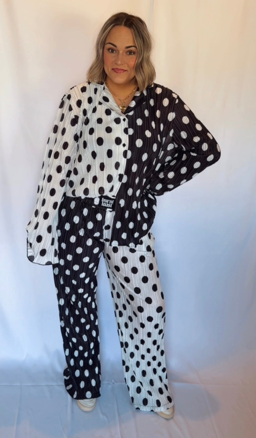 Make a statement in this Connect the Dots Set designed for those who love bold contrast and effortless comfort. Featuring a relaxed button-front top and coordinating wide-leg pants, this eye-catching set pairs black-and-white polka dots in a striking mixed pattern for a look that’s equal parts playful and chic.