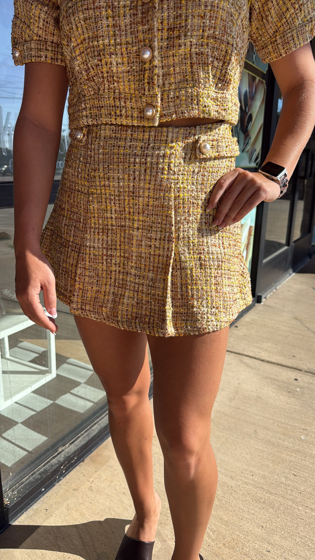 Bring a touch of classic charm to your fall wardrobe with our Golden Harvest Tweed Mini Skirt. Designed in a luxe textured tweed woven with warm mustard, cream, and caramel tones, this high-waisted mini is the perfect blend of timeless and modern. The flattering A-line silhouette and chic front flap accents with pearl-style buttons add a refined touch that pairs beautifully with cozy knits or its matching cropped tweed top.