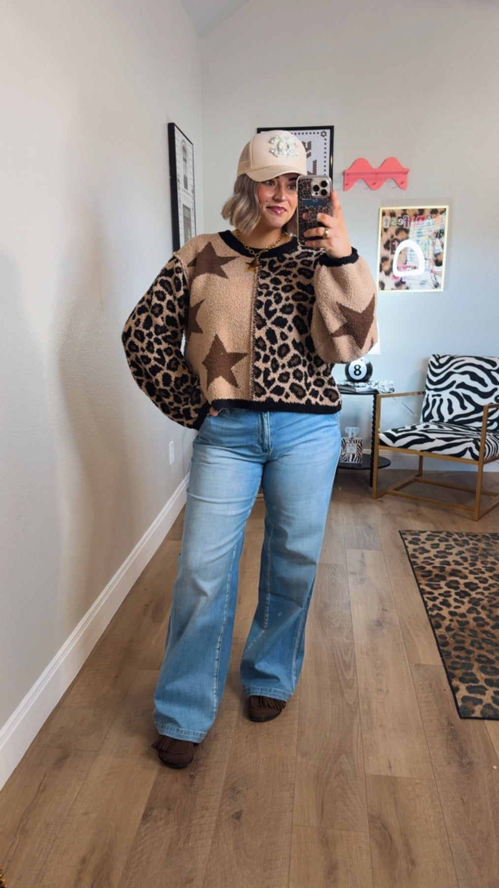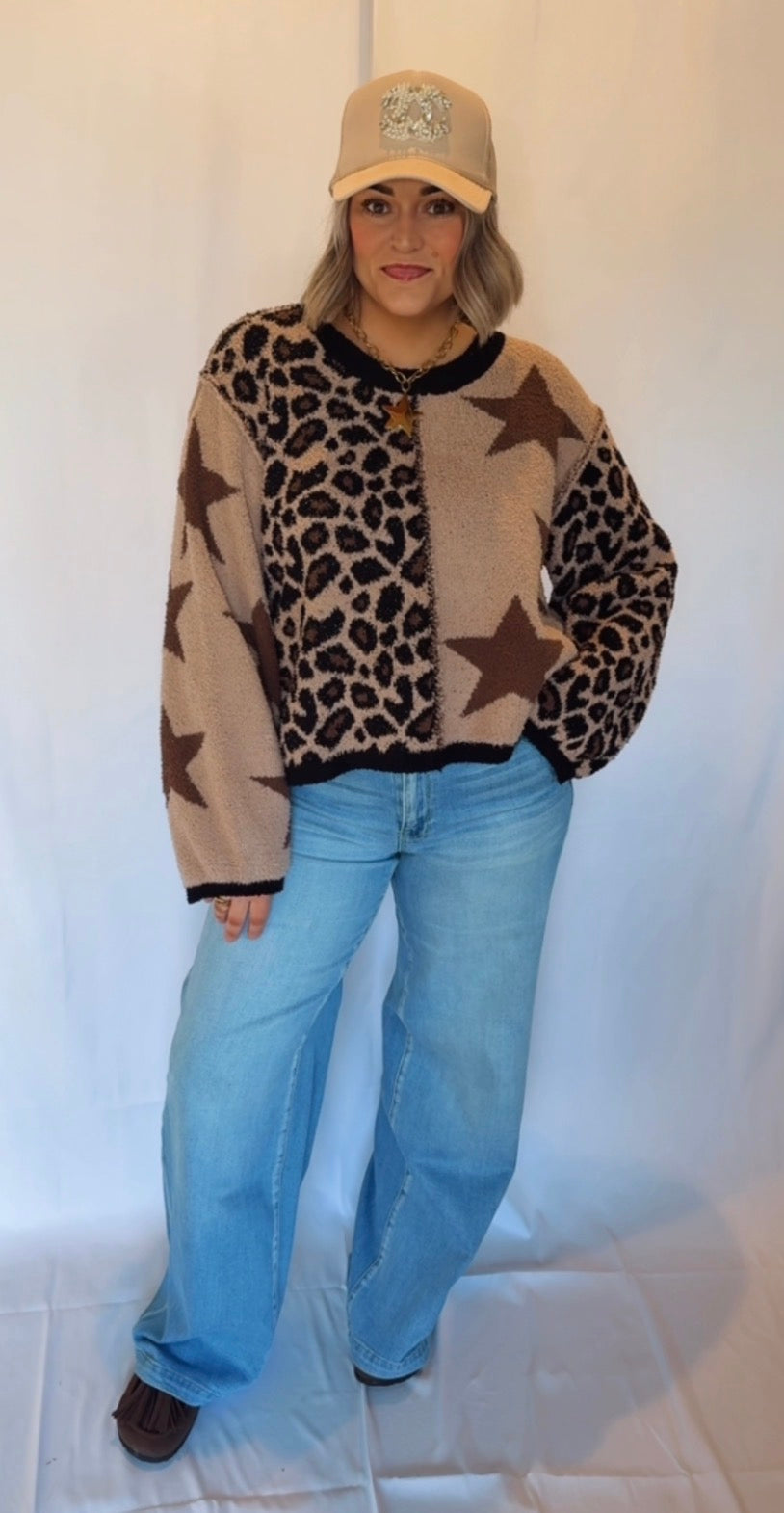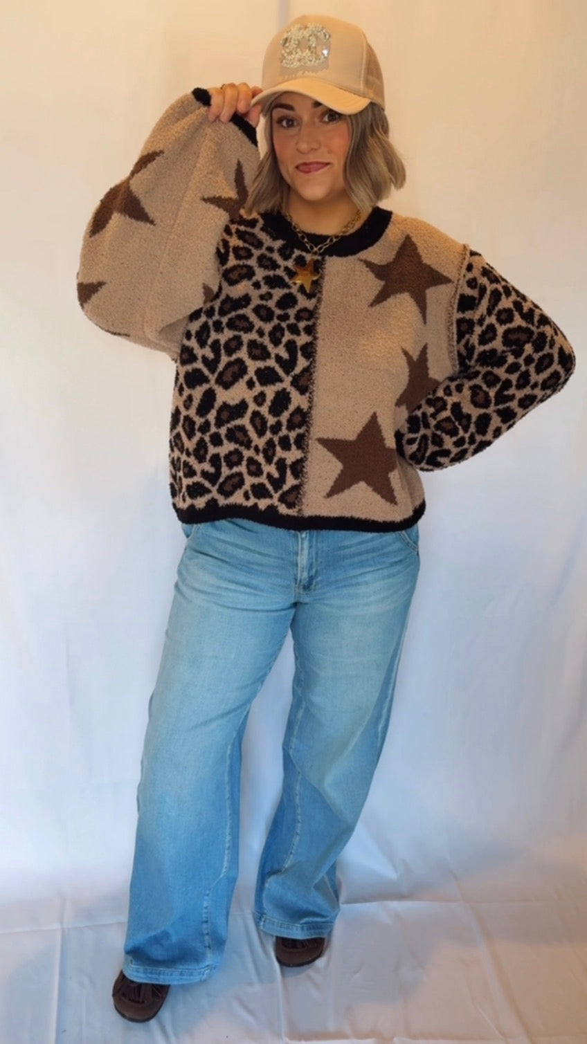 Cozy with a statement twist, the Starstruck Leopard Knit Sweater is the perfect blend of playful and bold. Featuring a mixed pattern design with leopard print and oversized star details, this sweater brings instant personality to any outfit.